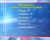 В Международный женский день 8 Марта в Кемеровской области родились 64 ребёнка, 32 мальчика и 32 девочки. Больше всего детей появилось на свет в Кемерове (15) и Новокузнецке (10), совсем чуть-чуть от нашего города отстал Прокопьевск (9). По распоряжению губернатора Амана Тулеева была объявлена областная акция «Родился ребенок», в рамках которой все женщины, родившие детей в Международный женский день, получат по 10 тыс. рублей и медальон «Рожденному на Земле Кузнецкой». Такие акции проводятся по инициативе Тулеева с 2000 года. Они проходят пять раз в год: в День матери, на Новый год и Рождество, 8 Марта и в День защиты детей. Что интересно, год назад рожденных 8 марта было почти на 20 малышей больше - 82 ребёнка, 46 мальчиков и 36 девочек.